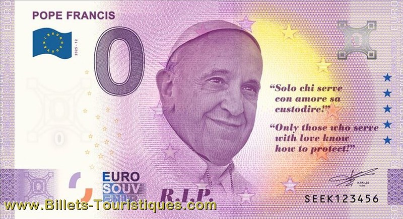 Représente : Le billet rend hommage au pape François suite à son décès le (...)